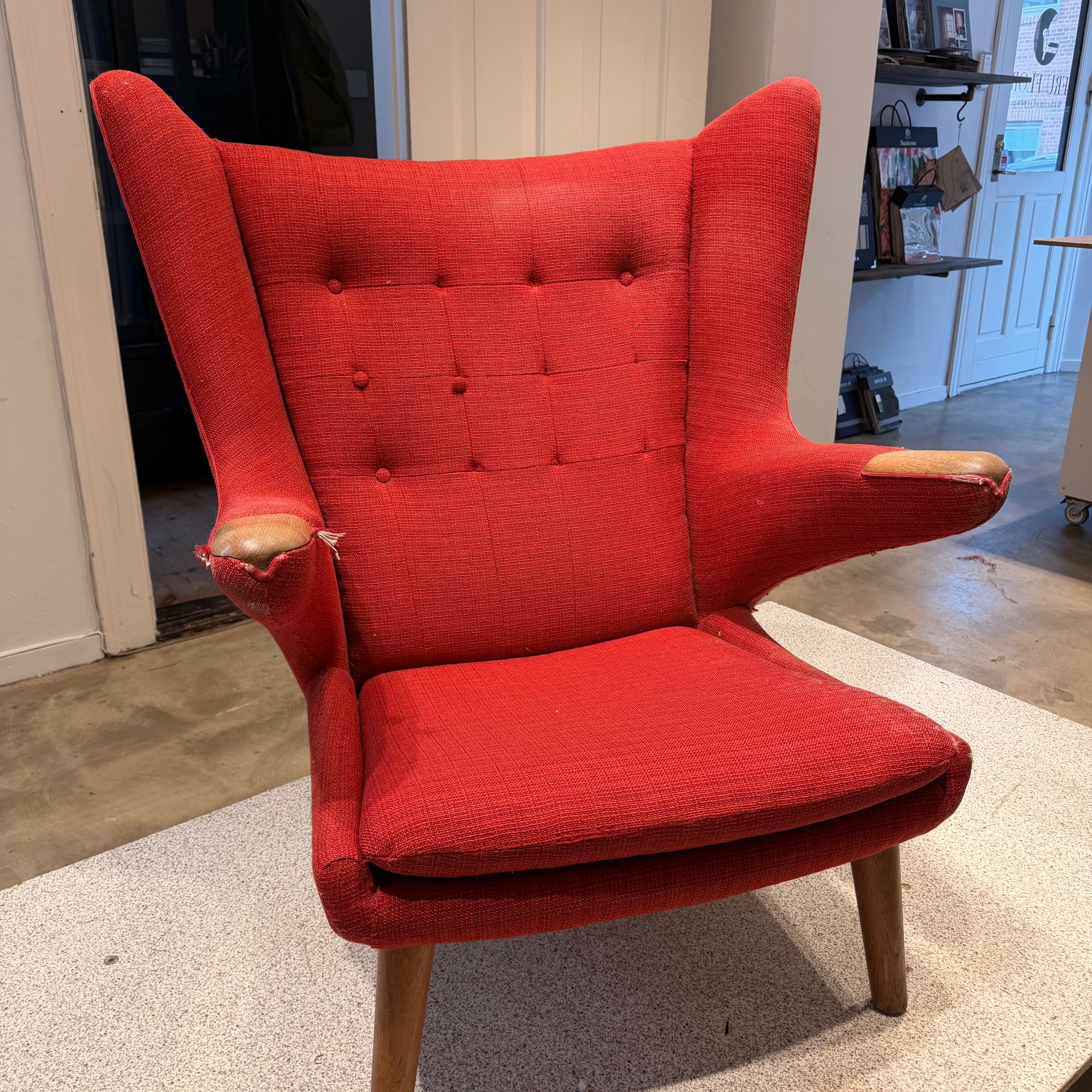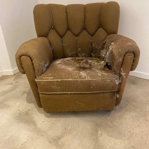 Slidt armstol før ompolstring hos møbelpolstrer i Odense på Fyn